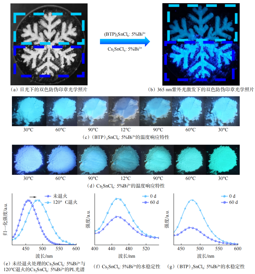 图7利用Cs2SnCl6: 5%Bi3+和(BTP)2SnCl6: 5%Bi3+在STE发光特性的差异,设计了温度响应型双色荧光防伪图案。热循环处理过程中,两者的发光强度均随着温度升高而出现不同程度的热猝灭,其中Cs2SnCl6: 5%Bi3+的PL峰从原本的451 nm红移至486 nm,可能因为热退火过程中形成了Cl⁻空位,削弱了[BiSn+VCl]发光中心。此外,经去离子水中浸泡60天后,Cs2SnCl6: 5%Bi3+粉末的PL强度保持原有强度的68%,表明样品具有较好的水稳定性。