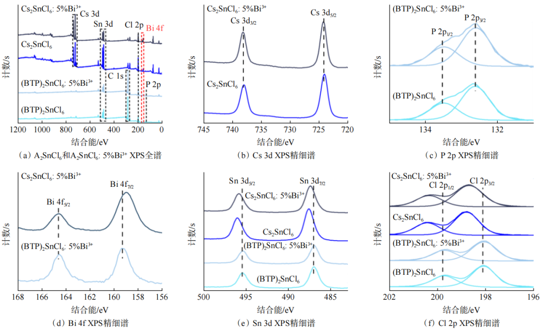 XPS分析(如图3)进一步确认了Bi3+的成功掺杂,并揭示了A位阳离子取代对材料电子结构的显著影响。研究发现,无论是B位引入Bi3+,还是A位用大尺寸有机阳离子BTP⁺取代Cs⁺,都导致了Sn 3d和Cl 2p结合能向低能方向移动。表明[SnCl₆]²⁻单元电子密度增加、结构孤立化增强。该结果清晰地表明,A位与B位的协同取代策略在调控晶格软性和电子结构方面发挥了重要作用。