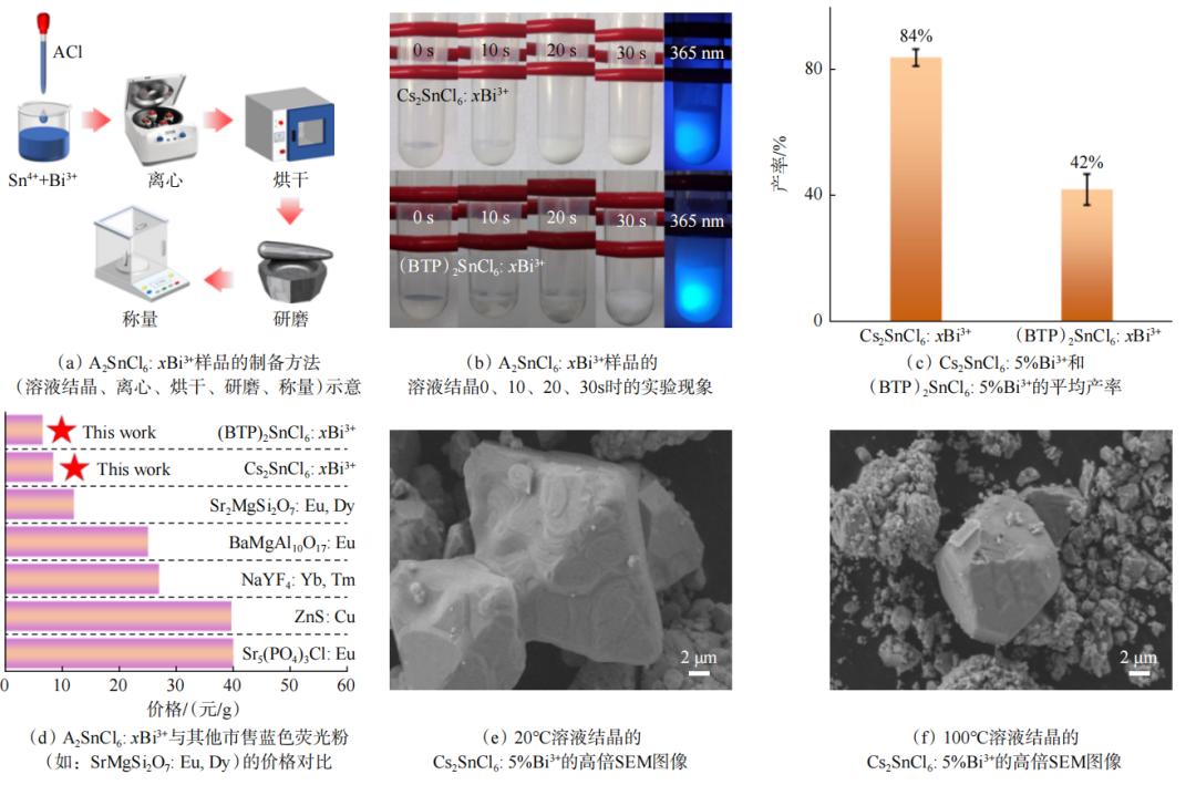 如图1所示,不同于传统的水热法,该溶液结晶法通过溶液制备、反溶剂结晶、离心、烘干及研磨等简单操作即可获得Cs2SnCl6: 5%Bi3+和(BTP)2SnCl6: 5%Bi3+,其合成产率分别达到了84%和42%,显示出良好的规模化生产潜力。此外,Cs2SnCl6: xBi3+、(BTP)2SnCl6: xBi3+的制备成本显著低于市售蓝色荧光粉,展现出优越的经济性与应用前景。在不同的反应温度条件下分别合成了Cs2SnCl6: xBi3+系列晶体,100℃和20℃下合成的晶体形貌差别不大,但20℃下的晶粒更大,结晶质量更佳。因此,为获得更优的微观结构和晶体质量,后续样品均在20℃的温和条件下进行溶液结晶。