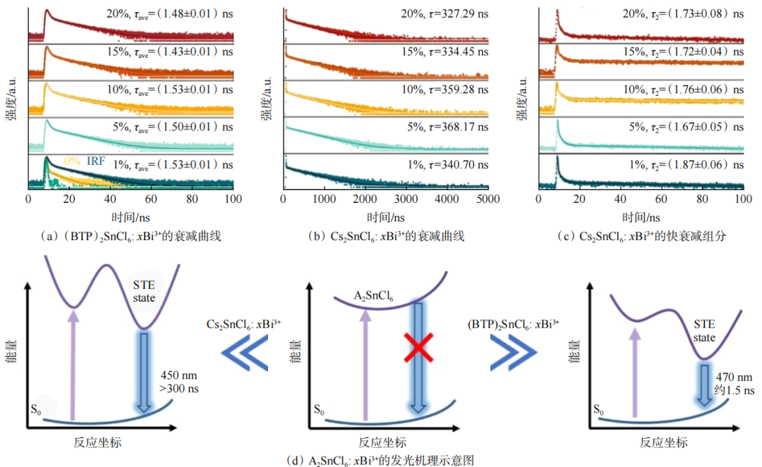 发光寿命测量(图6)显示,(BTP)2SnCl6: xBi3+的衰减寿命均保持在1.5 ns左右,而Cs2SnCl6: xBi3+的衰减寿命则显著延长至百纳秒量级。结合文献表明,两者发光均源于STE辐射复合,但寿命相差近百倍。这说明(BTP)2SnCl6: xBi3+与Cs2SnCl6: xBi3+体系的STE形成与复合过程具有本征差异:当Cs+被BTP+取代后,[SnCl6]2–八面体晶格松弛,柔性增强,局域畸变程度减弱,导致STE态的束缚势阱深度变浅,缩短荧光寿命。