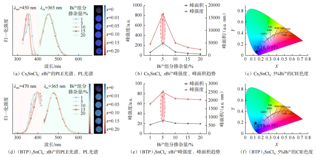 荧光光谱分析(图4)显示,Cs2SnCl6: 5%Bi3+的发射强度和PL峰面积均达到最大,表明该掺杂浓度下STE发光性能最优,对应CIE色坐标为(0.14,0.07)的蓝光区域。(BTP)2SnCl6: 5%Bi3+的CIE色坐标移动到(0.13,0.19)的天蓝色区域。这表明,A位有机阳离子引入增强了晶格柔性,降低STE束缚势阱和激发态局域畸变,从而显著影响激发态载流子的运动、耦合与辐射复合。