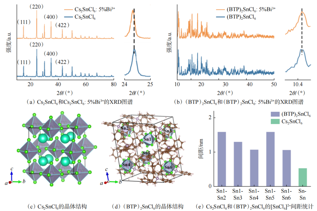 如图2所示,XRD分析验证了A2SnCl6: xBi3+的成功合成。Bi3+掺杂导致Cs2SnCl6: 5%Bi3+(220)晶面对应的衍射峰出现了轻微低角偏移,反映晶格膨胀。然而,(BTP)2SnCl6与(BTP)2SnCl6: 5%Bi3+的XRD衍射峰未发生明显的移动,推测原因在于Cs+半径远小于体积庞大的BTP+,结构参数的影响被BTP+的位阻效应所掩盖。结合结构优化计算显示,Cs2SnCl6中[SnCl6]2–八面体间距远小于(BTP)2SnCl6,表明Cs2SnCl6晶格更紧凑,而(BTP)2SnCl6结构刚性较低。