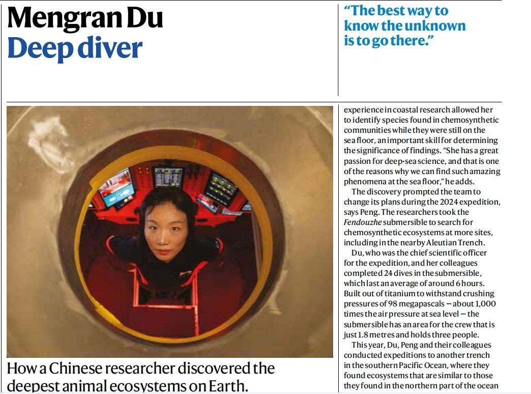 英国《自然》杂志8日公布了年度十大人物榜单,评选出了2025年最重大科学事件的中心人物,DeepSeek创始人梁文锋、中国科学院深海科学与工程研究所地质学家杜梦然上榜。《自然》特写部编辑布兰登·马赫表示:“今年的榜单颂扬了对新前沿的探索,医疗领域突破性进展的希望,对科研诚信的坚定守护,以及那些可以拯救生命的全球政策的制定者。我们激动地看到这么多人在不遗余力地理解自然世界,并在许多情况下帮助这个世界。这是他们入选今年《自然》十大人物的原因。”