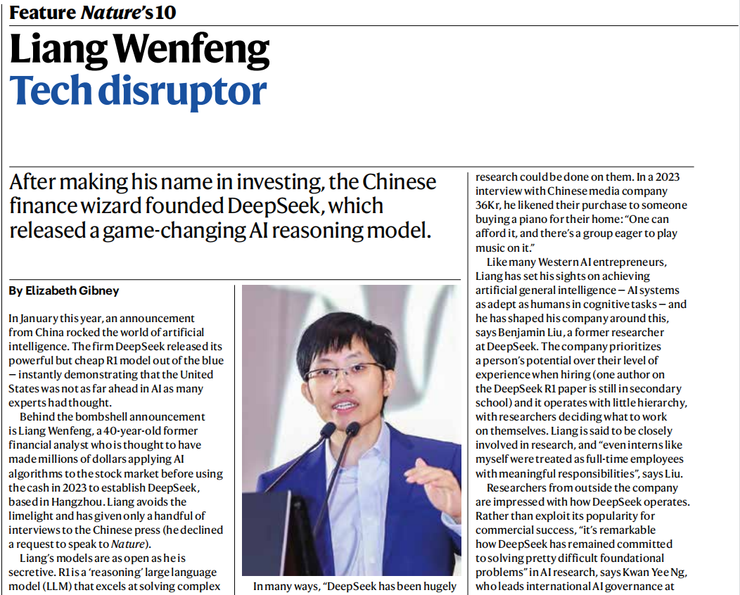 《自然》公布2025年度十大科学人物,梁文锋、杜梦然上榜