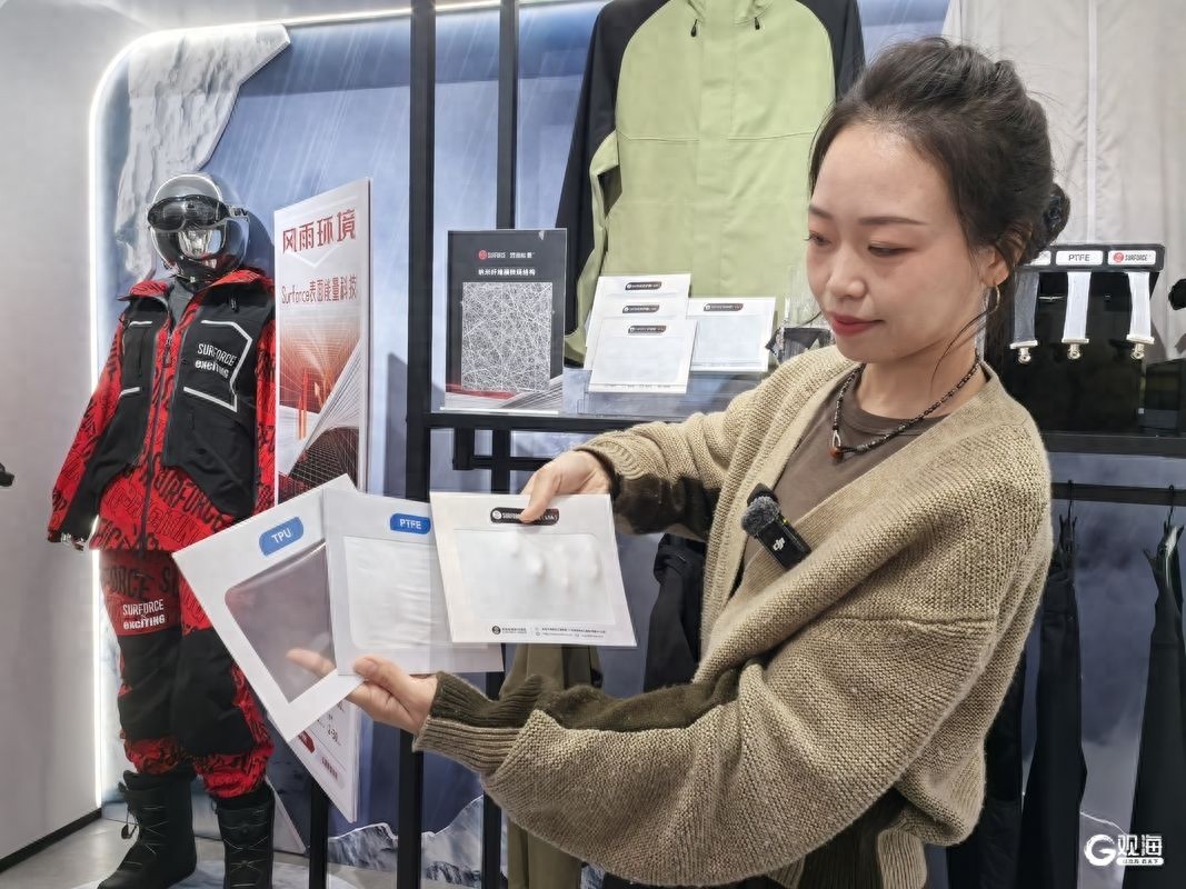 在表面能量位于青岛高新区的生产车间内,记者看到,纺织原材料经过特殊工艺处理变成可纺溶液,经管道进入纳米纤维宏量生产线。产线上方,一万多个细针状喷头协同工作,向下方收集膜均匀喷出薄雾般的纳米纤维。去除收集膜后,即可获得防风防水、透气透湿、柔软有弹的Surforce纳米纤维膜。