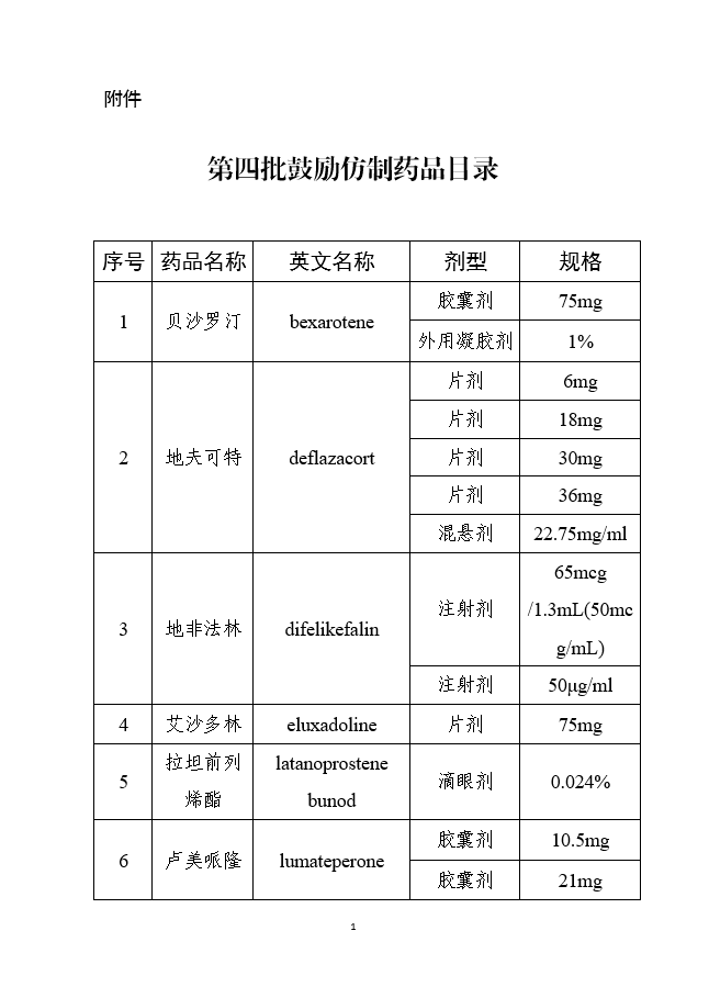 为落实国务院办公厅《关于改革完善仿制药供应保障及使用政策的意见》有关制定鼓励仿制药品目录的部署和要求,国家卫生健康委联合工业和信息化部、国家知识产权局、国家医保局、国家药监局等部门组织专家对国内专利即将到期及临床供应短缺(竞争不充分)的药品进行遴选论证,制定了《第四批鼓励仿制药品目录》。现印发给你们,请推动相关工作开展。各相关部门要按照有关规定,在临床试验、关键共性技术研究、优先审评审批、生产供应保障等方面予以支持。