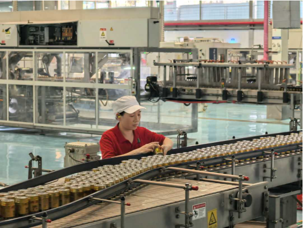 在位于咸宁高新区的中国红牛湖北生产基地,工作人员在检测产品。依托丰富的水资源和绿色生态环境,咸宁食品饮料产业迅速发展,集聚饮料品牌700多个,年产饮料超过70亿罐,世界级饮料生产基地初具规模。(柳洁)
