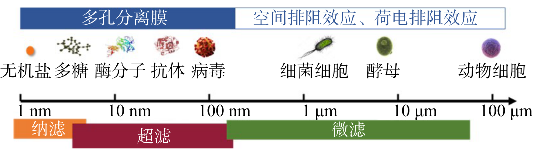 膜分离技术是利用溶液中分子或颗粒透过膜的能力差异进行分离的一种非热力学过程,广泛应用于生物药制造的浓缩、换液、精制和去除微生物污染等环节。其中,压力驱动的超滤与微滤膜分离技术因其孔径范围几乎涵盖了生物医药制备过程所涉及各类颗粒的尺寸,从而在生物药分离纯化过程中应用最为广泛(图1)。目前,微滤技术已成为《中国药典》规定用于药品、生物制品、医疗器械和原料等生产以及性状检测的除菌工艺之一。