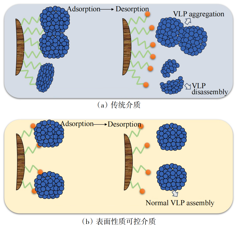 通过调控介质的配基种类和密度、在基质和配基之间引入一定长度的间隔臂以及定点偶联等方法,优化介质表面性质,提高介质对复杂生物大分子的纯化效率。以类病毒颗粒疫苗为例,通过调控离子交换介质和疏水介质的配基密度,以及配基与基质之间的间隔臂长度等,能够有效抑制多聚亚基疫苗在吸附−解吸附过程中的聚集和解聚,疫苗活性回收率和纯化倍数均有明显提升(图5)。