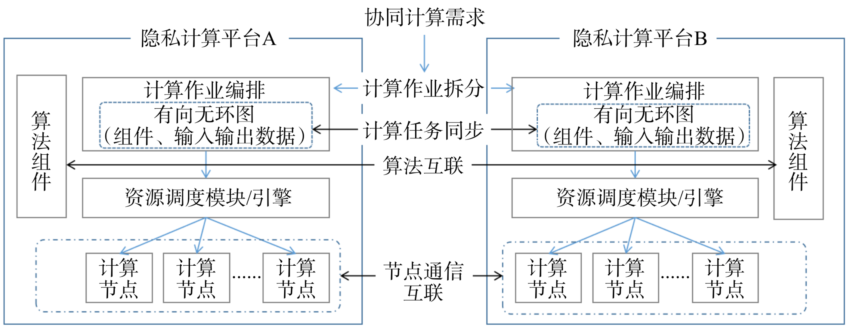 算法互联的是当用户发起如隐私求交、联合统计或联合建模推理等任务时,不同隐私计算平台调用内部算法组件协同完成任务的算法执行过程互联。计算任务调度的互联是指多方发起计算任务后,不同的隐私计算平台完成不同的task,同步task的执行状态和结果数据,每个task调用独立的算法组件完成,同步内容与DAG中作业编排数据对象中的元数据结构相符。计算步骤的互联互通是不仅包含了task状态和数据的同步,也包含了task执行过程中的数据同步。