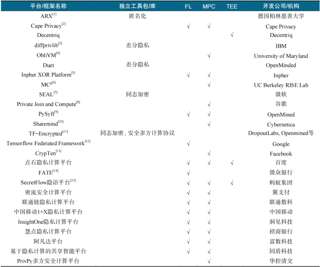 根据公开信息,整理了国内外主流的隐私计算平台和典型隐私计算工具,隐私计算平台从上文提到的主流技术视角主要分为3类,具体如表1所示。