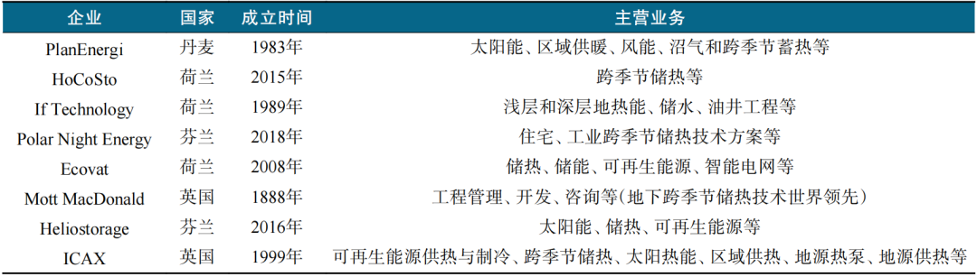 以丹麦和加拿大为代表的国家已建立了诸多跨季节储热供暖实验平台和示范工程。丹麦科技大学在1983年建立了世界首例500 m3大型储热水体,丹麦政府提出规划, 2035年全部利用可再生能源作为电能和供热来源,2050年完全替代化石能源。2016年底,世界范围内规模最大的相变储热区域供暖系统已在丹麦建成,目前丹麦已有成熟的大型相变储热区域供热技术。表3为国外跨季节储热领域技术领先厂商及主营业务。
