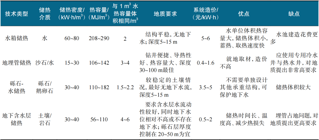 大规模跨季节储热在经济性、低碳化等方面已具有可行性,其将全年余热收集起来,变废为宝、实现零碳,可有效解决可再生能源供热系统在时间、空间和强度上的不匹配特性,扩大热能利用的深度与广度。另外,大规模跨季节储热与储氢、储电、储水发电、储高压气等新型储能方式相比成本更低。地下跨季节储热因其技术成熟度高、应用广泛,具有高储存效率和高储存容量等优点,使其成为当前跨季节储热研究与应用的主要方向。