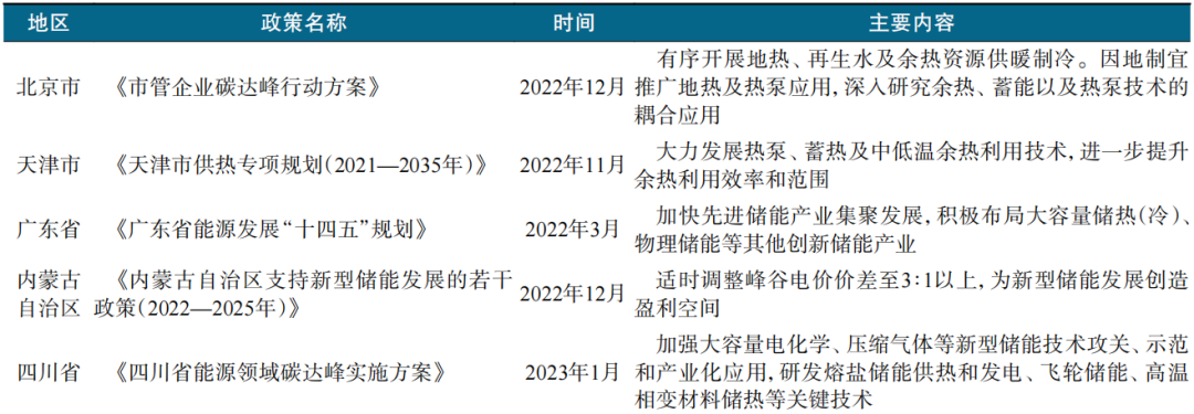 储热作为一种新型储能技术被广泛地应用在清洁供暖、火电灵活性改造、综合能源服务等多个能源细分领域,其发展离不开政策的引导与支持。表1和表2为近几年国家和地方层面发布储热相关政策及主要内容。