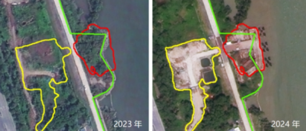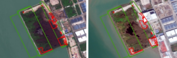二是用海用岛项目“全过程透视镜”:推动监管模式从事后查处向过程防控转变。针对用海用岛项目监管中面临的“数量多、分布广、发现难”问题,遥感大模型提供了“批后—过程—成效”全链条智能化解决方案,通过将已批复项目范围图斑与全市最新年度遥感影像变化检测结果叠加比对,自动筛查超范围用海、擅自改变用途等违规风险,极大压缩了人工核查范围,使监管力量聚焦于“变化点”和“风险点”,推动用海监管从“事后查处”向“过程防控”升级。