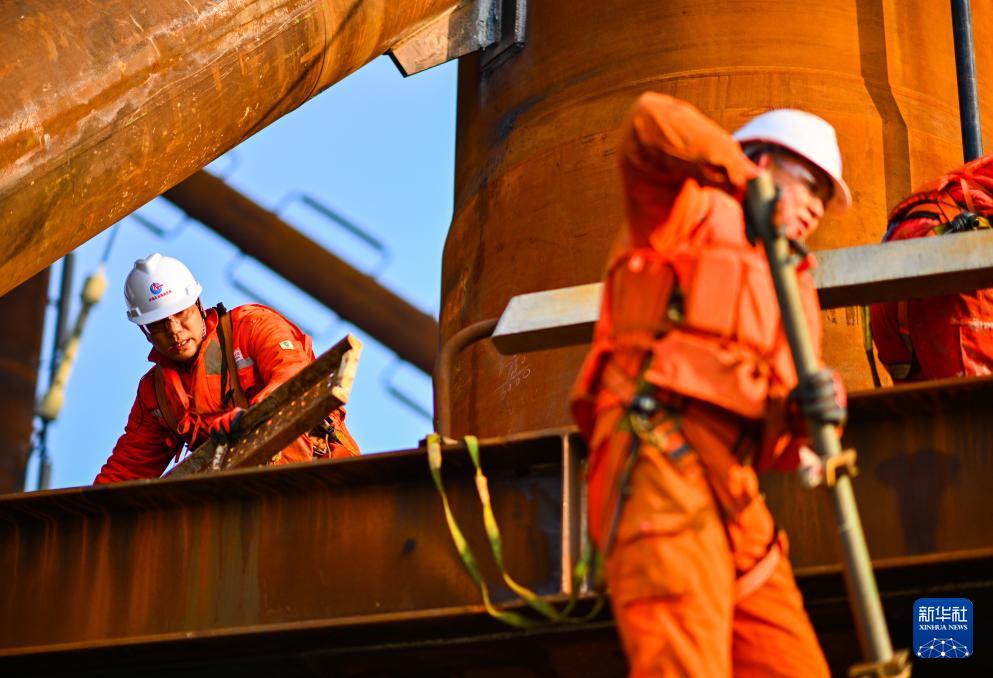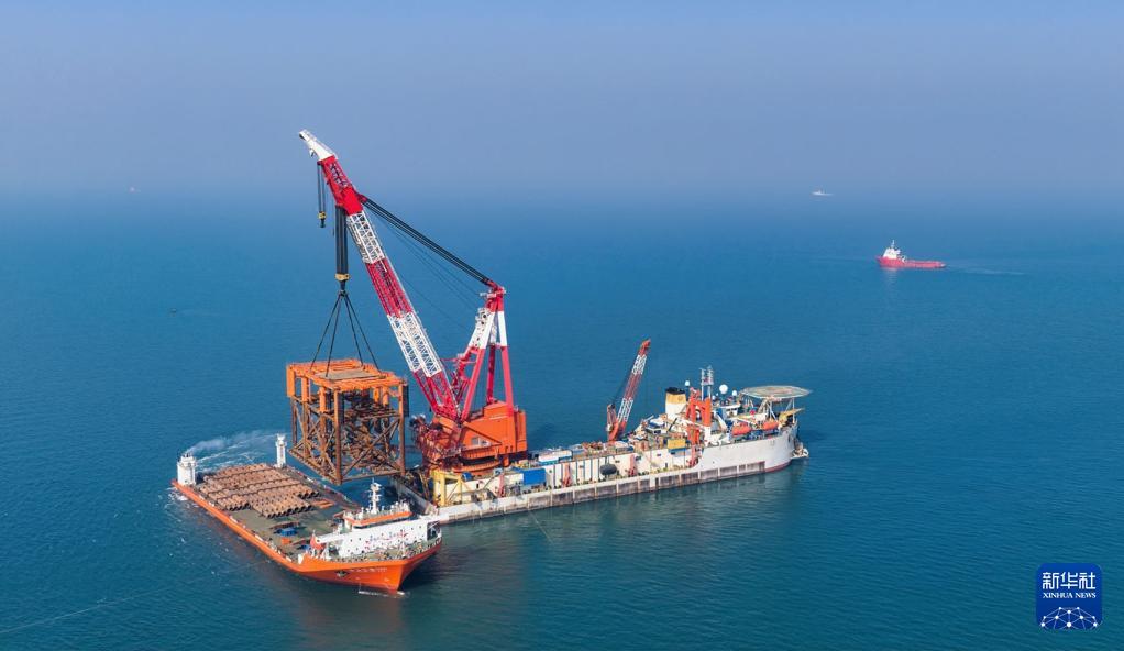 这是2月13日拍摄的渤中26-6油田开发项目(二期)导管架安装现场(无人机照片)。新华社发(杜鹏辉摄)