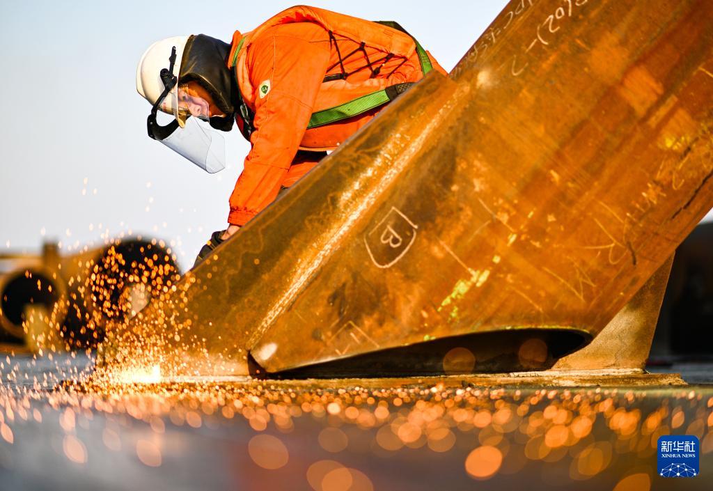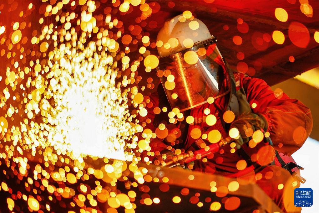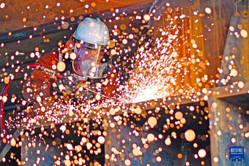 2月13日,工人在作业现场进行气割作业。新华社发(杜鹏辉 摄)