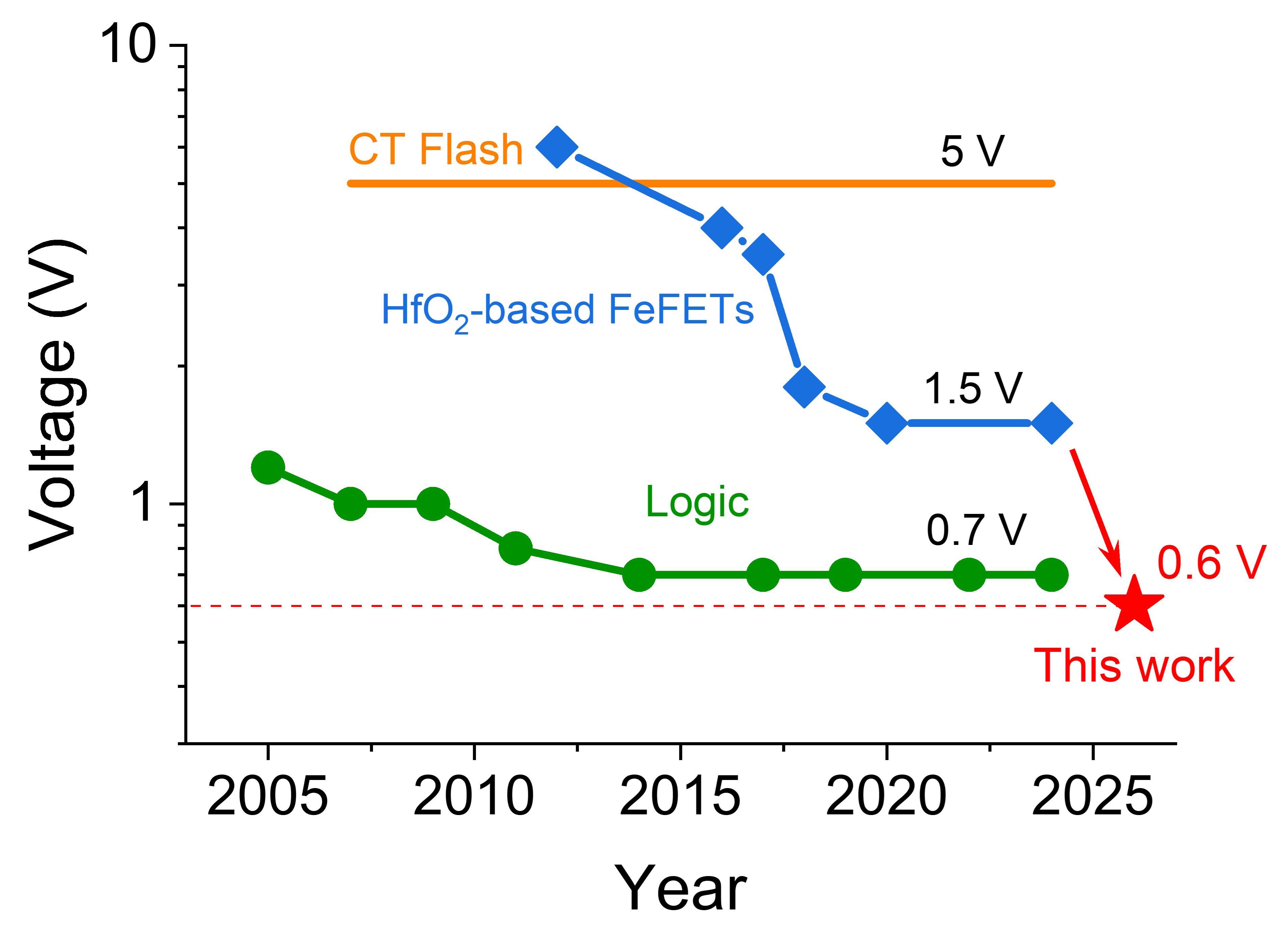 然而,传统铁电晶体管存在能耗过高、逻辑电压不匹配等短板限制了其大规模应用。为此,北京大学邱晨光研究员—彭练矛院士团队,利用纳米栅极结构设计,巧妙解决了铁电材料“改变极化状态”需要高电压高能耗的问题。