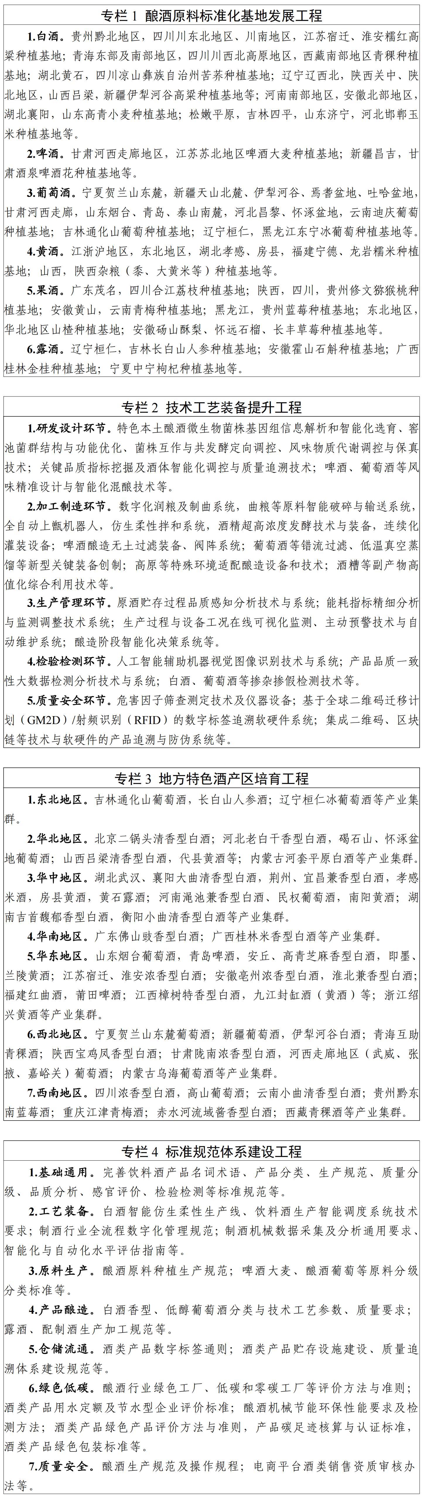 20.建立健全标准规范体系。健全覆盖酿酒产业全链条的标准体系,重点开展基础通用标准、特色酒种及其生产规范、检验检测方法标准等制修订。加快标准体系协调配套、相互贯通,开展标准宣贯,鼓励社会团体和企业制定高于国家标准和行业标准相关技术要求的团体标准和企业标准。推动标准体系向绿色生产、智能酿造、消费升级等领域延伸。