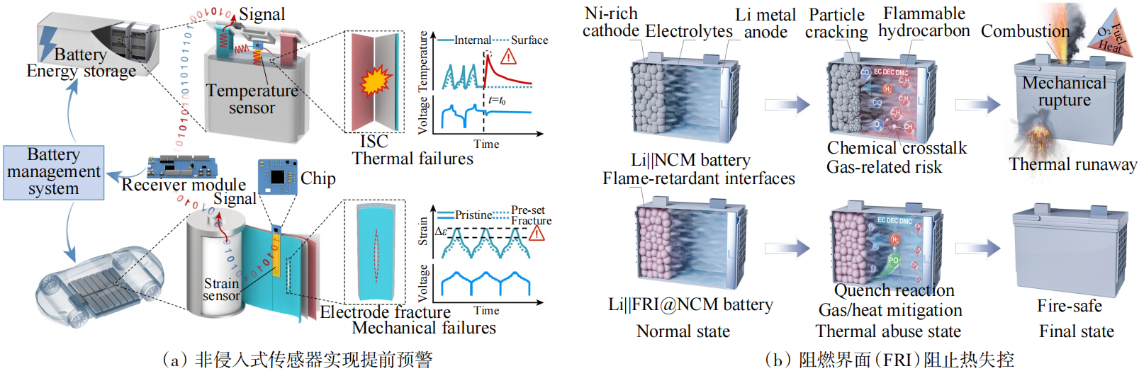 捕获电池内部信号实现早期故障诊断和智能预警,能提前发现电池热失控风险,将其遏制在萌芽阶段。Fan等开发了一种小型化、低功耗的非侵入性传感系统,能够精确传感和无线传输锂电池内部的温度和应变信号,可用于快速识别早期热故障和机械故障,提前预警并进行故障定位(图7(a))。