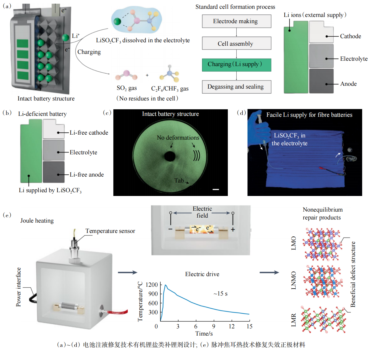 电池注液修复技术是一种无损回收技术,关键原理是向容量衰减的电池中注入特定的修复电解液,补充锂源、修复SEI膜、消除结构缺陷,从而恢复电池的容量和循环性能。该技术无需拆解电池,流程简单,操作便捷,能最大程度保留电池的结构完整性。Chen等设计了一种有机锂盐类补锂剂,补充电池循环过程中损失的锂源,减少活性物质的消耗;添加特定的添加剂可调控SEI膜的成分与结构,降低界面阻抗,提升离子传输效率(图9(a)~图9(d))。