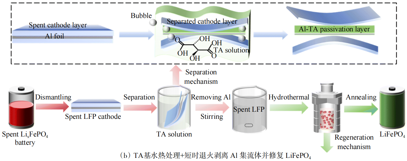 液相体系的修复技术具备修复产品均匀性更佳、反应条件更温和的优势。Hao等提出酒石酸(TA)基水热处理+短时退火的一体化方案。其中TA既作为还原剂也作为锂源载体修复LFP结构,又通过与Al箔表面反应实现非破坏性正极剥离(图8(b))。Zhao等利用茶多酚作为天然电子供体,修复破损的碳涂层。