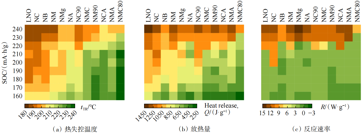图6 不同组成层状正极的热失控温度、放热量、反应速率与充电程度关系