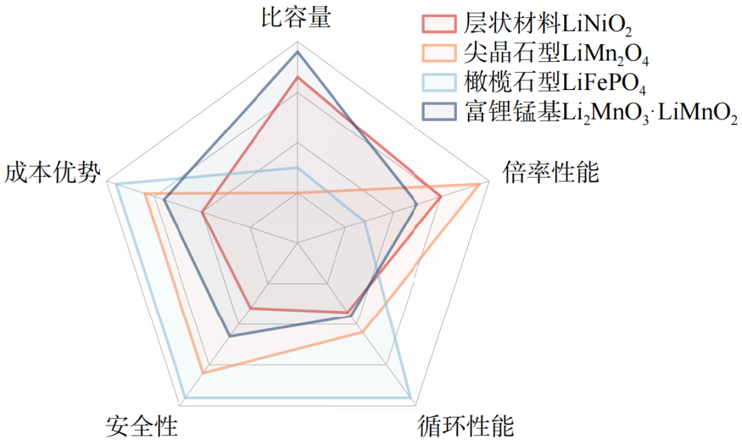 为满足EV、规模储能等领域对更长续航与更小体积储能系统的核心需求,持续提升能量密度是锂电池技术发展的首要目标。电池能量密度提升本质依赖于材料容量的突破,图1对比了不同正极材料的性能指标,其中高镍三元正极与富锂锰基正极被认为是最具潜力的2大路线。