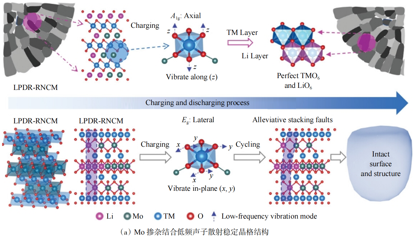 Jia等开发了Mo掺杂结合低频声子散射稳定晶格结构策略(图8(a)),降低正极材料中TM—O共价键的弯曲和伸展振动频率,并抑制TM原子的迁移和缺陷结构的形成。