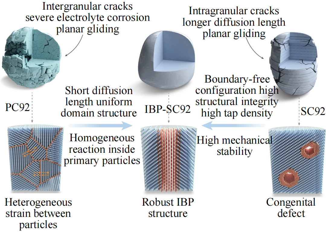 Zhang等则通过B和Nb的协同掺杂在单晶超高镍LiNi0.92Co0.03Mn0.05O2正极中构建晶格内键合相(IBP),成功解决了单晶材料中锂离子扩散路径长、反应不均匀和晶格应变累积的问题,还显著提升了离子迁移速率,并有效抑制了H2−H3相变过程中的晶格畸变与氧流失,实现了高度均匀的电化学反应(图2)。