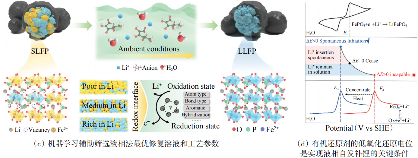 考虑到高温高压的条件在大规模生产中难以实现,如何在常温常压下实现液相体系的均匀补锂成为研究人员的关注重点。Tang等基于机器学习的回收体系筛选技术,最终确定溶液有机还原剂的低氧化还原电位是实现自发补锂的关键条件,且通过机器学习筛选出抗坏血酸–LiOH的体系,最终修复后的LFP在5 C倍率下循环500次容量保持率达96%(图8(c)、图8(d))。Lü等提出光催化修复技术,利用紫外光激发产生高能电荷载体多巴胺,降低Fe原子的迁移能垒,促进错位Fe原子回归晶格位点,同时实现锂离子的重新嵌入。
