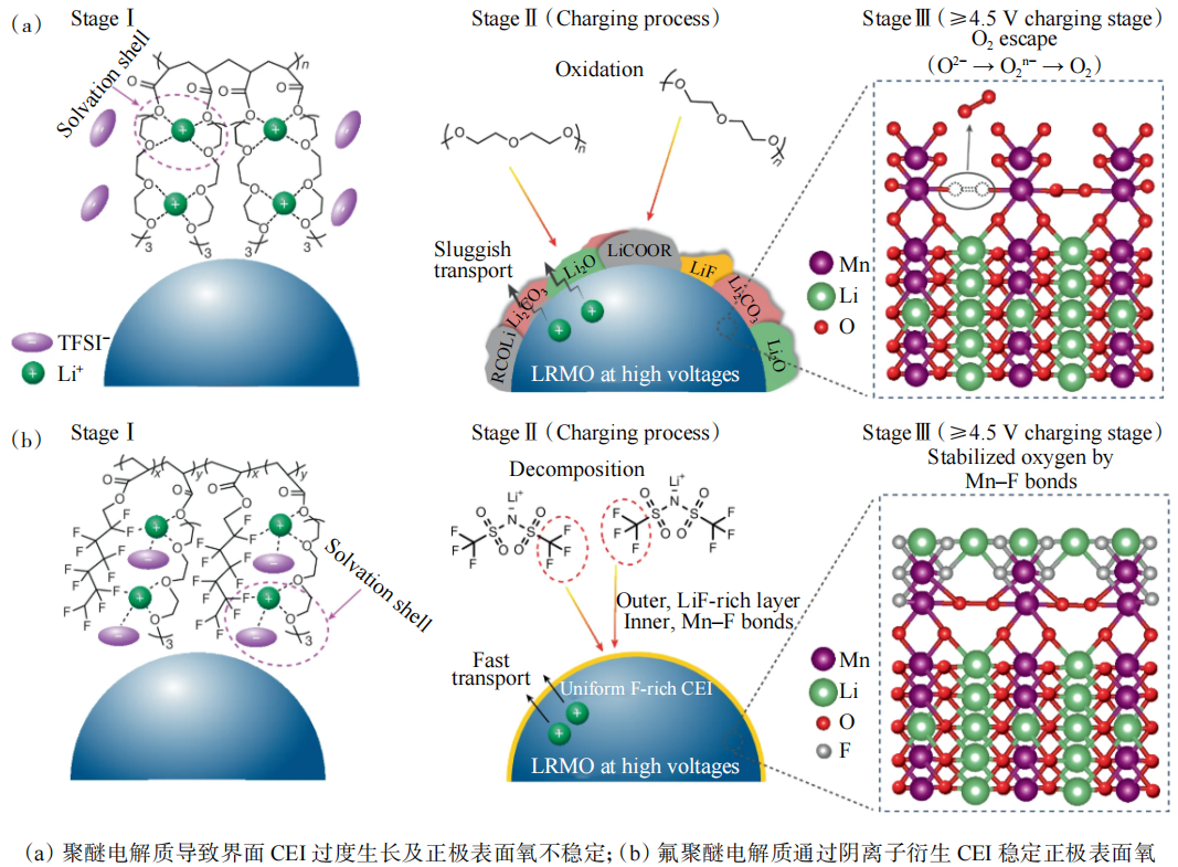 Sun等提出一种“溶剂中继”电解质策略,在高温下诱导离子解离,从而显著地提升了热稳定性。欧阳明高团队提出无碳酸乙烯酯(EC)电解质体系,使锂离子优先与阴离子配位,通过提高最低黏分子轨道(LUMO)能级,降低溶剂还原副反应。Huang等设计了一种由强溶剂化聚醚和弱溶剂化氟烃悬浮物组成的含氟聚醚基聚合物电解质,形成富含阴离子的溶剂化结构,从而在正极和负极上形成阴离子衍生的富氟界面层,以抵抗界面问题(图3)。