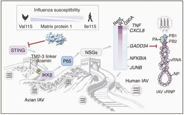 团队发现,人源流感病毒编码的M1蛋白能够有效拮抗(阻抑)人源STING–NF-κB–GADD34抗病毒通路,而禽源流感病毒的M1蛋白在这一方面能力明显不足。后续研究表明,M1蛋白第115位氨基酸由缬氨酸(Val)向异亮氨酸(Ile)的进化突变,显著增强了病毒对人源STING通路的拮抗能力。