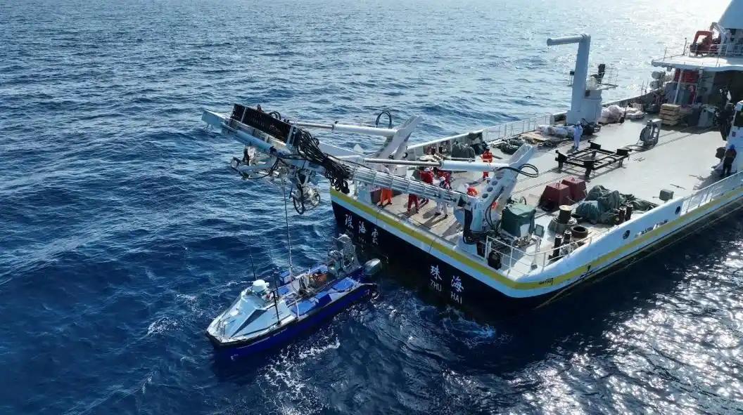 “珠海云”无人智能母船释放无人船在国家海洋综合试验场(深海)开展协同测量作业(海南省海洋厅供图)