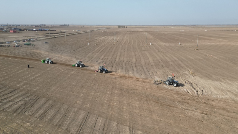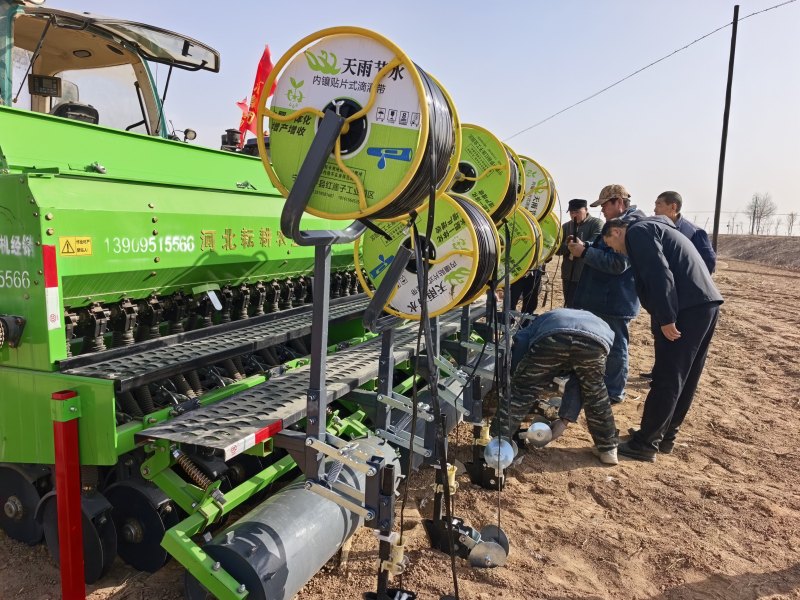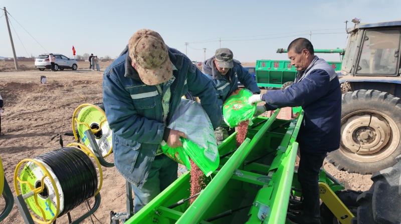 与传统播种机不同,德润集团使用的种肥同播一体机装配了滴灌管道铺设装置,随着播种机匀速行进,机身后6条滴灌管道被精准铺设在田间,实现了播种与管道铺设同步进行。