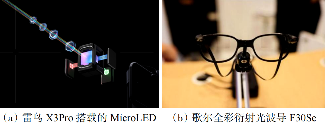 国内技术以“量产落地”为核心导向,形成全价位覆盖体系。高端领域,雷鸟创新联合上海显耀显示科技(JBD)公司建成全球首条全彩MicroLED光波导量产线,其雷鸟X3ProAR眼镜搭载0.36 cm3全彩MicroLED光机(图3(a)),峰值入眼亮度6000 nits,户外强光下彩虹纹抑制率95%,核心光波导模组良率提升至80%;凭借该技术优势,雷鸟创新以39%的市场份额登顶2025年第二季度全球AR眼镜销量榜首。歌尔光学公司发布碳化硅刻蚀全彩衍射光波导F30Se(图3(b)),依托碳化硅高折射率特性,实现镜片厚度0.65 mm、重量3.5 g、透过率超90%的性能突破;同步推出的0.2 cm3全彩MicroLED光机支持单目4K显示,重量仅0.5 g,为高端AR终端提供核心部件支撑。中低端领域,谷东智能公司自研偏振体全息光波导技术,与光峰科技公司联合推出“一拖二”方案(单主机适配双眼镜终端),将AR眼镜终端价格压缩至1500~2000元区间,较行业均价降低40%以上,成为推动消费级AR“千元化”普及的核心推手。