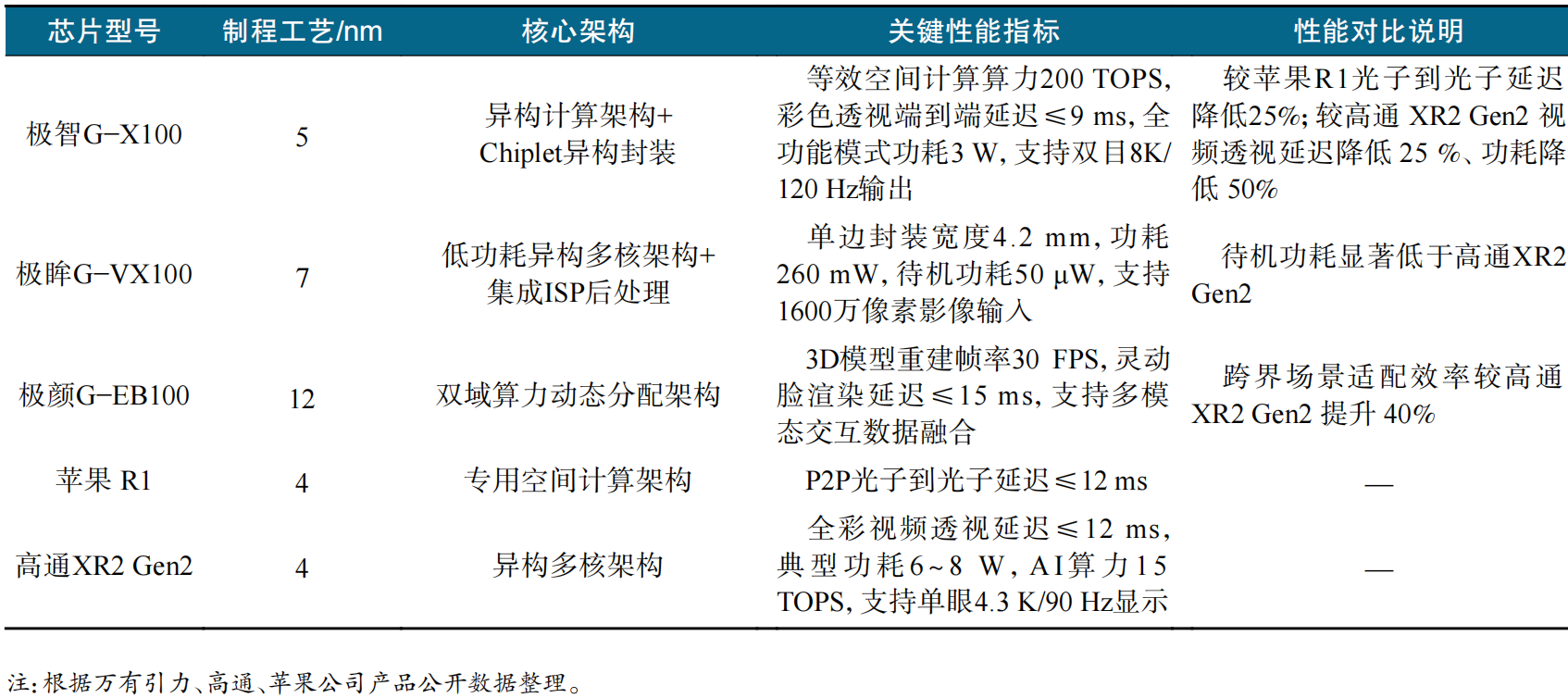 专用协处理芯片是推动XR硬件性能升级与形态创新的关键支撑。在XR专用协处理芯片架构(以苹果R1为代表)提出之前,全球XR设备的核心算力支撑多依赖高通XR系列等通用架构的XR专用移动处理器,存在算力供给、功耗控制与场景适配性失衡等痛点。2025年,国内的万有引力科技有限公司推出极智G−X100等3款自主研发的空间计算专用协处理器,通过制程工艺迭代、异构架构设计与场景化算力分配优化,实现高性能与低功耗核心突破,标志着国产空间计算专用协处理器芯片正式迈入“高性能−低功耗”协同进化新阶段。