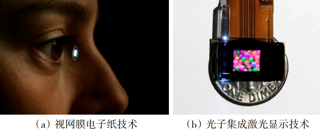 光学显示系统是XR设备实现轻量化与高性能融合落地的核心支撑。2025年,国内外企业围绕高分辨率、微型化、低成本3大技术方向持续攻坚,形成了“国外前沿探索+国内量产落地”的差异化发展格局。国外技术聚焦极致性能突破,为行业提供长期方向参考。瑞典查尔姆斯理工大学等机构联合研发的“视网膜电子纸”技术,以560 nm氧化钨超小像素为核心,依托被动结构色反射原理实现25000 PPI超高分辨率,达到人类视觉感知极限,彻底消除“纱窗效应”;其1.4 mm×1.9 mm的瞳孔级屏幕尺寸与被动显示的低能耗特性,完美适配AR眼镜“轻量化、长续航”的需求(图2(a)),当前仅需解决全彩化适配过程中的像素串扰问题。Meta公司的光子集成激光显示技术,通过氮化硅光子芯片与硅基液晶(LCoS)面板集成,色域覆盖达sRGB标准的211%,设备厚度仅2 mm,体积缩减80%(图2(b)),破解激光显示“高性能与小型化不可兼得”的行业痛点,适配专业级AR场景需求。