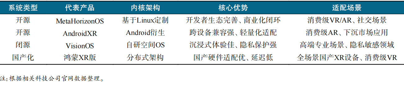 从“内核架构−核心优势−适配场景”3个维度对2025年XR操作系统4大核心阵营展开对比:开源系统以“生态开放、跨设备兼容”为核心竞争力,侧重消费级与下沉市场覆盖;闭源系统聚焦“沉浸式体验与隐私保护”,瞄准高端专业领域;国产化系统突出“国产硬件适配与低延迟”,填补本土XR设备软件生态空白,各阵营形成差异化互补格局,核心优势对比如表3所示。