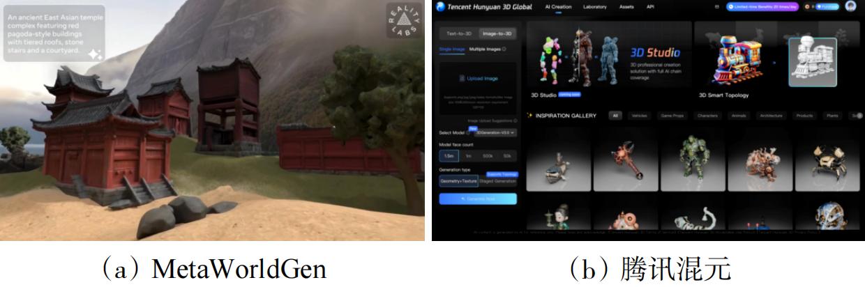生成式AI通过“多模态输入−模型生成−轻量化优化”的自动化流程,重构XR内容创作链路,大幅降低制作成本与周期。高保真效果依托多模态融合扩散模型实现物理属性精准还原;轻量化通过“剪枝+量化+LOD细节适配”技术,将3D模型体积压缩70%以上。核心技术突破与产业价值主要体现在3方面:一是标准化场景建模效率实现跃迁,MetaWorldGen可通过单文本提示在5 min内生成50 m×50 m的交互式3D世界(图6(a)),避免传统方法视角移动后的质量衰减问题,适用于游戏、沉浸式社交等场景;二是个性化与跨场景适配能力提升,腾讯混元3D创作引擎支持文字、图片、草图多模态输入,5~10 min即可生成高质量3D作品(图6(b)),其智能拓扑功能可自动优化模型面数,适配Unity、UnrealEngine等专业引擎;三是工业级建模精度实现突破,南京大学联合强思数科公司将AI建模精度提升至≤±2 mm,10 min即可完成流程工业数字孪生建模(传统方法需5 d),节约60%人工工时,适配工业虚拟调试场景。