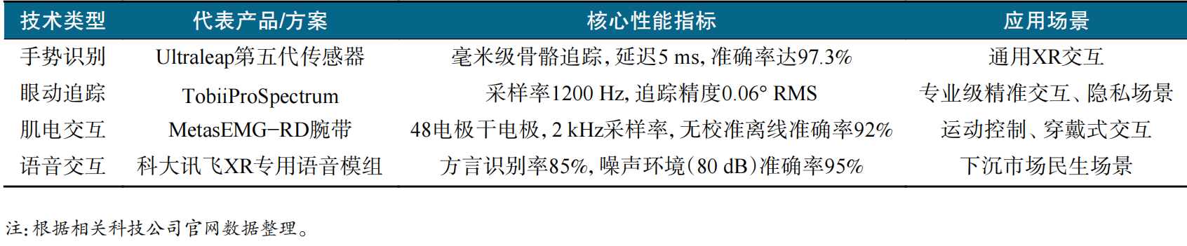 单模态技术聚焦“高精度、低干扰、低功耗”核心目标实现关键突破:手势识别可实现毫米级骨骼追踪(延迟5 ms,准确率97.3%),眼动追踪采样率1200 Hz(精度0.06°RMS),肌电交互无校准离线准确率92%,语音交互方言识别率85%,80 dB噪声环境下准确率95%,为多模态融合奠定坚实性能基础(表2)。