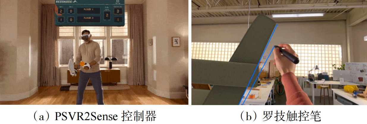 XR操作系统呈现“开源生态扩张、闭源生态深耕”的二元格局,叠加国产化系统补位,核心竞争聚焦兼容性与开发者友好度优化。开源生态方面,MetaHorizonOS发布《NorthStar》开源项目与HorizonKit组件库,第三方应用数量突破1.2万款,同比增长35%;谷歌公司AndroidXR深度融合Gemini大模型,制定统一接口与内容规范,显著提升跨品牌兼容率。闭源生态方面,苹果公司VisionOS升级手部追踪功能(频率达90 Hz)与眼动操作功能,兼容PSVR2Sense(图5(a))、罗技笔(图5(b))等多类型控制器,适配医疗、工业等高精度交互场景,强化隐私保护能力。国产化系统同步实现突破:华为鸿蒙XR版采用分布式架构,支持跨终端算力调度;字节跳动PICOOS将VR交互延迟优化至12 ms,兼容OpenXR1.1标准,第三方应用数量同比增长150%。