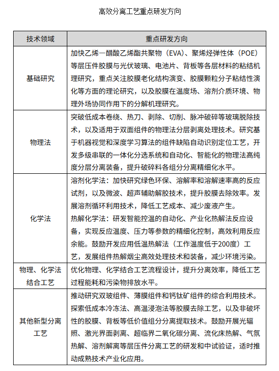 (二)突破高效分离工艺。开展光伏组件胶膜粘结机理研究,丰富完善胶膜低成本解离技术理论体系。加快研发晶硅单玻、双玻等组件的物理法、化学法、结合工艺及新型分离工艺,攻克光伏组件部件与胶膜的绿色、高效分离技术,鼓励开发非破坏性拆解技术,探索完整玻璃等材料获取路径。详见附件《高效分离工艺重点研发方向》。(工业和信息化部、生态环境部按职责分工负责)