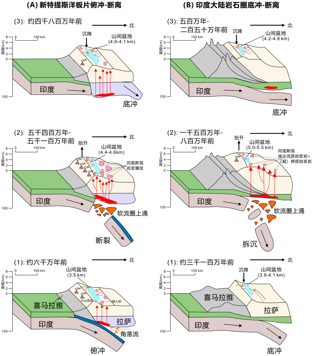 研究提出,第一次抬升是由俯冲的新特提斯洋板块断离引发的,第二次则是印度大陆岩石圈底冲(即水平俯冲)后的拆沉作用。而每次断离或拆离后的大陆岩石圈持续底冲作用,又像一只向下拖拽的手,导致地表沉降。