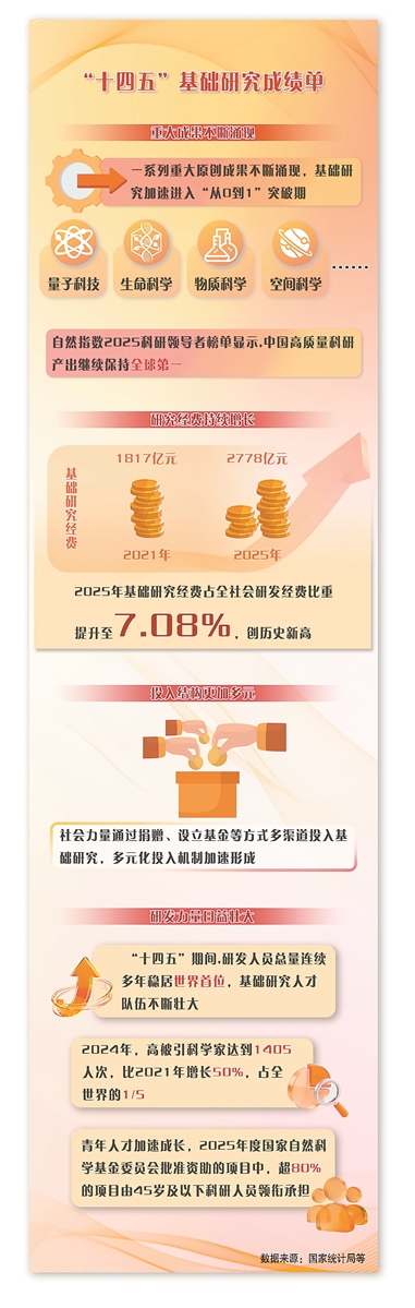 站在“十五五”的新起点上眺望,基础研究的蓝图已铺展开来。从战略性、前瞻性、体系化布局的顶层设计,到多元投入、分类评价、青年托举的微观破题,每一步改革都在为原始创新松绑,每一次突破都在为高质量发展蓄能。基础研究不再是象牙塔里的孤芳自赏,而成为国家战略与科学前沿交织、社会力量与政府投入共振的时代合奏。