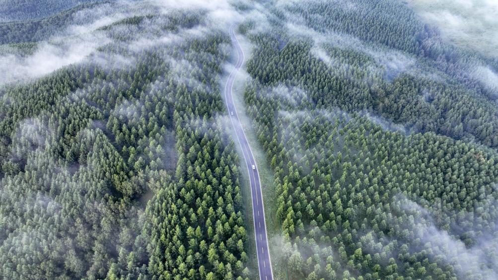 2024年7月26日拍摄的塞罕坝国家级自然保护区景色(无人机照片)。夏日清晨,位于河北省承德市的塞罕坝国家级自然保护区满目青翠,浩瀚林海壮美如画。