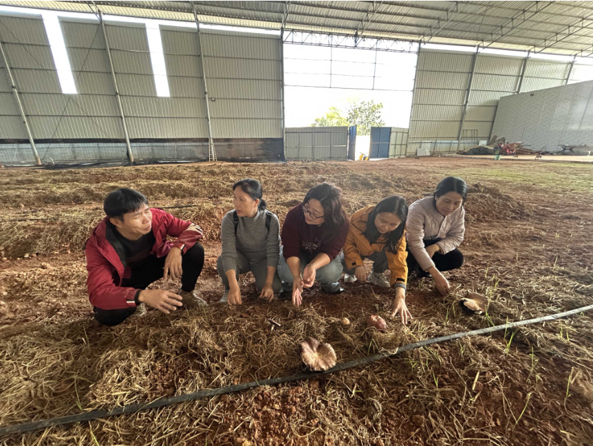 科技特派员们查看赤松茸菌丝生长环境中的秸秆及泥土覆盖层的厚度、湿度情况