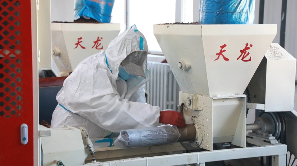 阿尔山市五岔沟镇食用菌生产车间接菌人员 宋英:“在科技护航下,我们的生产线控温更加精准,进一步规范了无菌化操作,保证菌棒成品率可达98%以上,帮助基地实现产量提升。”