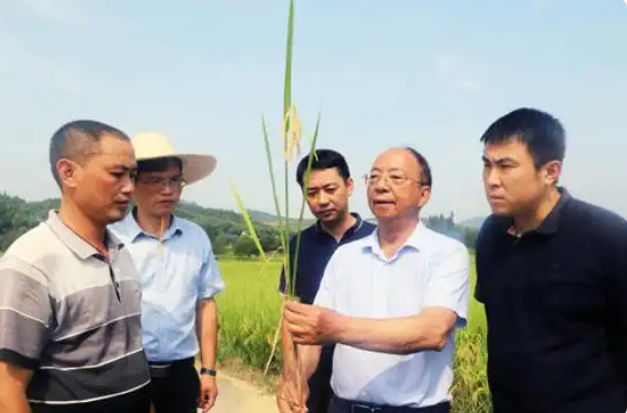 中国科学院院士谢华安(右二)到浦城指导再生稻新品种全程机械化栽培头季现场测产验收工作 (资料图 柯聪 何周超/摄)