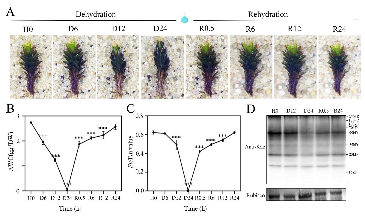 这一“秒级复苏”能力远超转录调控的时间尺度,且脱水-复水过程中转录与蛋白表达呈低相关性。由此提示齿肋赤藓可能采用“蛋白存储池”策略,而翻译后修饰正是激活这些预存蛋白的关键。然而,作为一种重要的翻译后修饰,乙酰化如何参与植物的极端耐干性尚不明确。